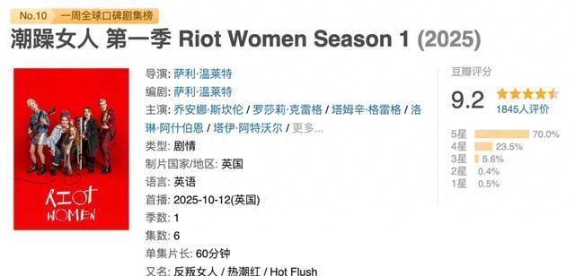 又有好剧了! 最近,又有一部英剧颇引东说念主关注,开播于今,豆瓣9.2分,况兼,本剧第一季如故厚爱杀青了。是以,这个分数是基于全季杀青后的合座施展给出的,如故有一定参照有趣的。 与此同期,本剧在BBC的收视率以及BBCiPlayer上的点播率也齐相当可不雅,并在开播没多久就连忙续订了第二季,足以证明注解其质地。 这即是刚刚第一季杀青的英剧《潮躁女东说念主》