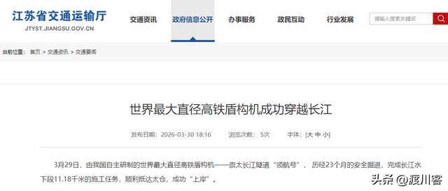 2026年3月29日,我国自主研制的寰宇最大直径高铁盾构机“领航号”,告成完成长江水下段11.18千米的施工任务,收效“上岸”。